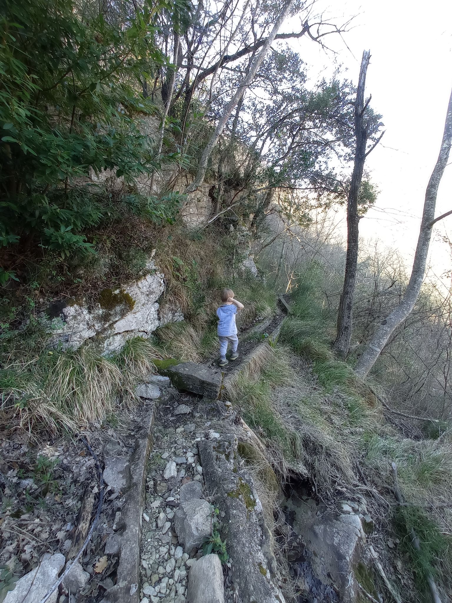 Są dwie możliwości dotarcia do skały. Pierwszy wariant startuje ze ścieżki, która zaczyna się na prawo od strumienia, za gospodarstwem agroturystycznym Da Ferrucio, zaś drugi zaczyna się bezpośrednio z zatoczki parkingowej przy głównej drodze (vis a vis skały). My wybraliśmy pierwszy wariant i to dojście można podzielić na dwie części: pierwsza to spacer przez gospodarstwo wygodną ścieżką, natomiast w momencie wejścia w zarośla przez kolejne 10 minut idziemy terenem tochę dzikim, momentami stromym. Ostatni odcinek pokonają tylko starsze dzieci (maluchy z pomocą mamy i taty – stromo).