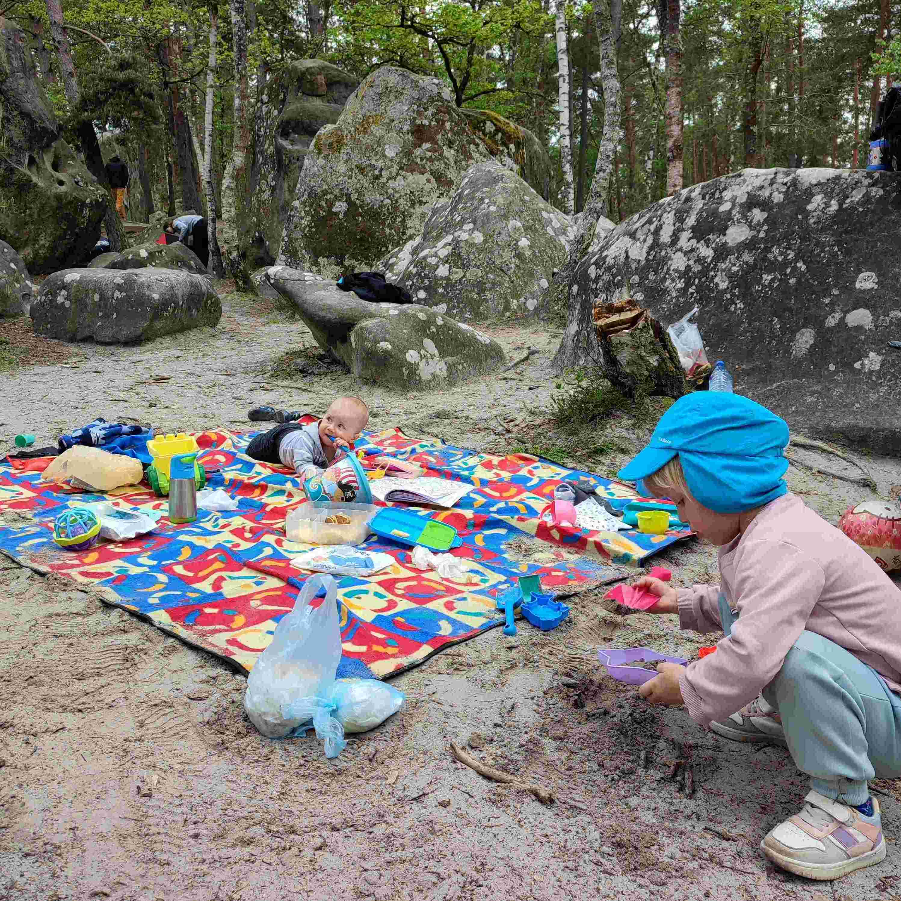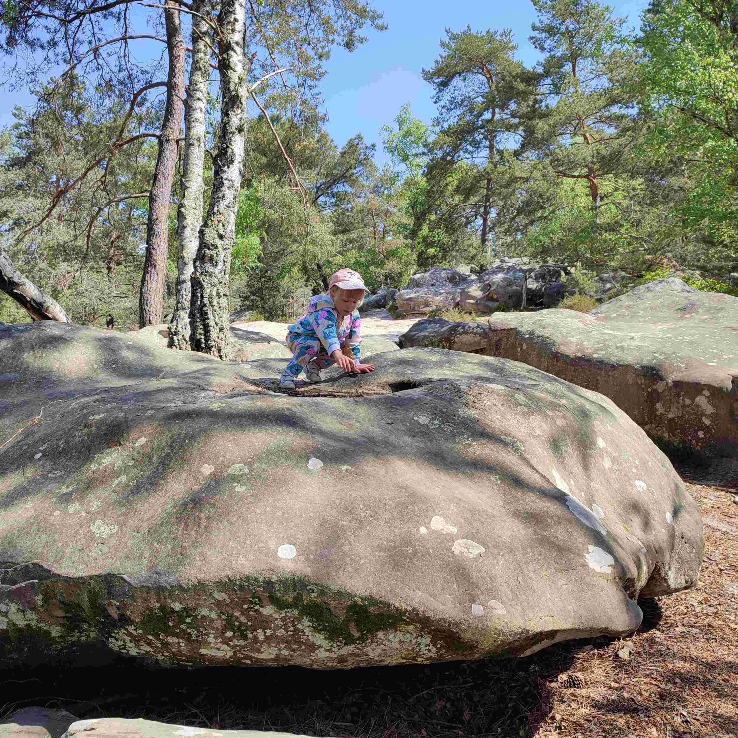 Żeby dotrzeć pod skały korzystaliśmy z przewodnika Jingo Wobbly Fontainebleau Fun Bloc Escalade – Bouldering. Google dobrze nawiguje na nazwy parkingów zaznaczone w książce. Czasy podejścia są wiarygodne, każda ścieżka oznaczona jest jako przyjazna/nieprzyjazna dla wózka, a poza tym zaznaczone są też miejsca piknikowe niezłe na większy obóz z dziećmi. Dobrze też pokazuje rozmieszczenie skał w przestrzeni – głazy mają swoje nazwy i numery na planie przestrzennym, które potem można odnaleźć na zdjęciach z zaznaczonymi drogami. Nie ma jednak co ukrywać, że w dużej mierze polegaliśmy po prostu na znajomych, którzy odwiedzali Fontainebleau już kilka razy i dobrze znali odpowiednie miejscówki dla dzieci.