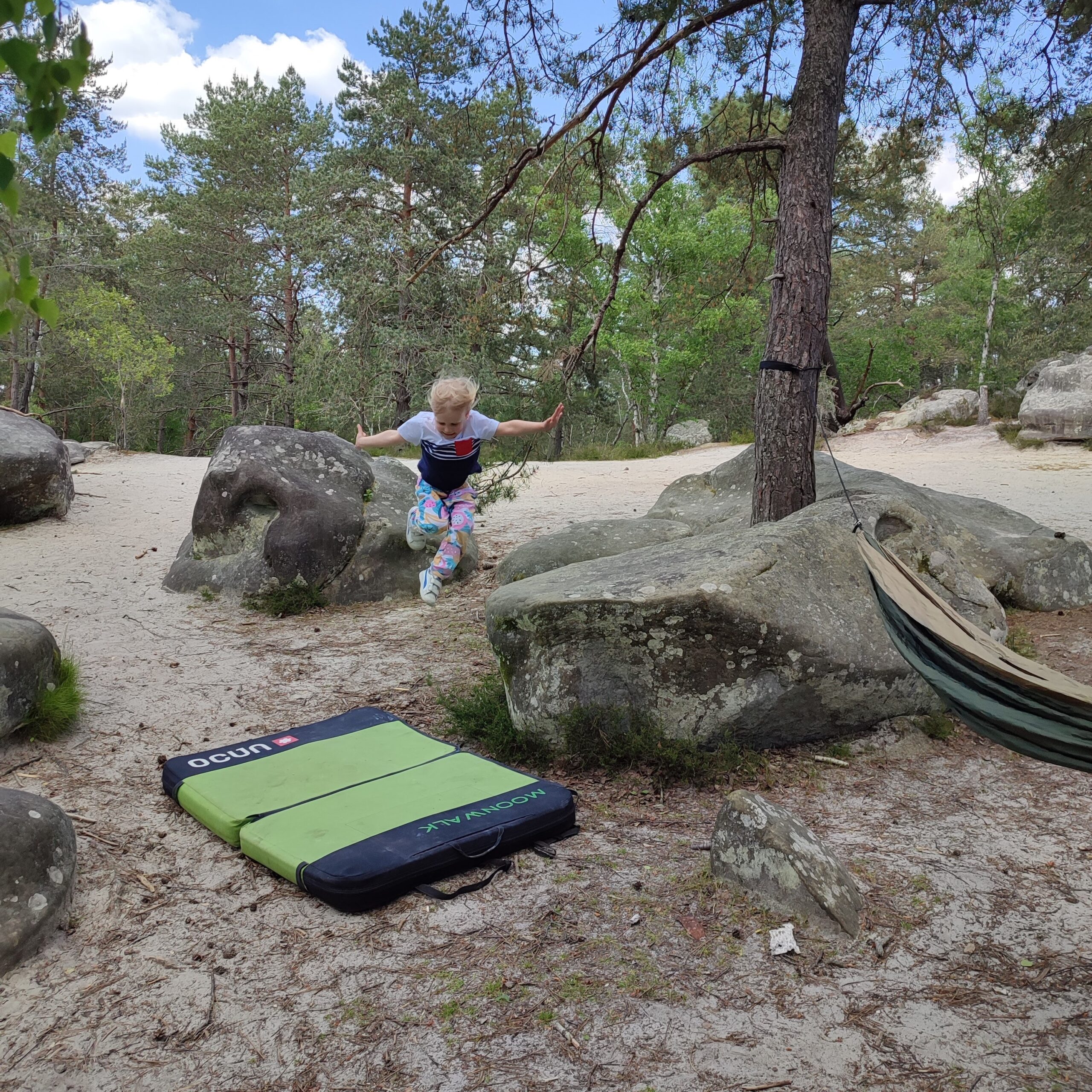 Jedną z ulubionych zabaw mojej córki było wynajdowanie niskiej skałki i skakanie z niej na crasha (warto dobrze przemyśleć ilość crashy do zabrania 😉). Pozwalało to na dłuższą chwilę zająć jej uwagę. Poza skakaniem lubiła po prostu wspinać się na niższe skałki, ale oczywiście nie w ramach wytyczonych dróg czy obwodów, a po prostu wchodzić po swojemu. Czasami robiła to naszą z pomocą, a innym razem w formie zabawy. Zapewniało mi to dodatkowe ćwiczenia z przybloku – znacie ten motyw, kiedy trzymacie skaczące dziecko jedną ręką, a w drugiej trzymacie młodsze ;).