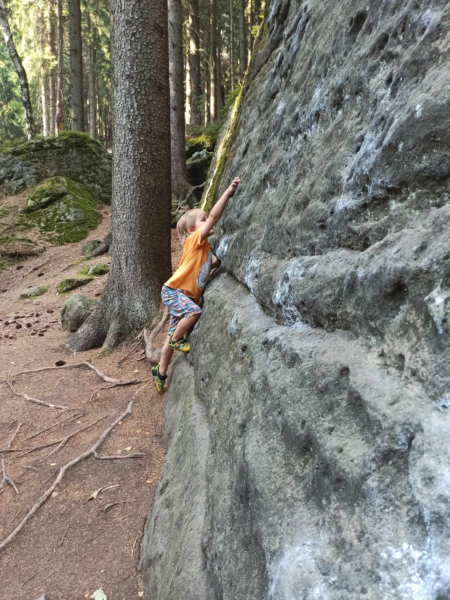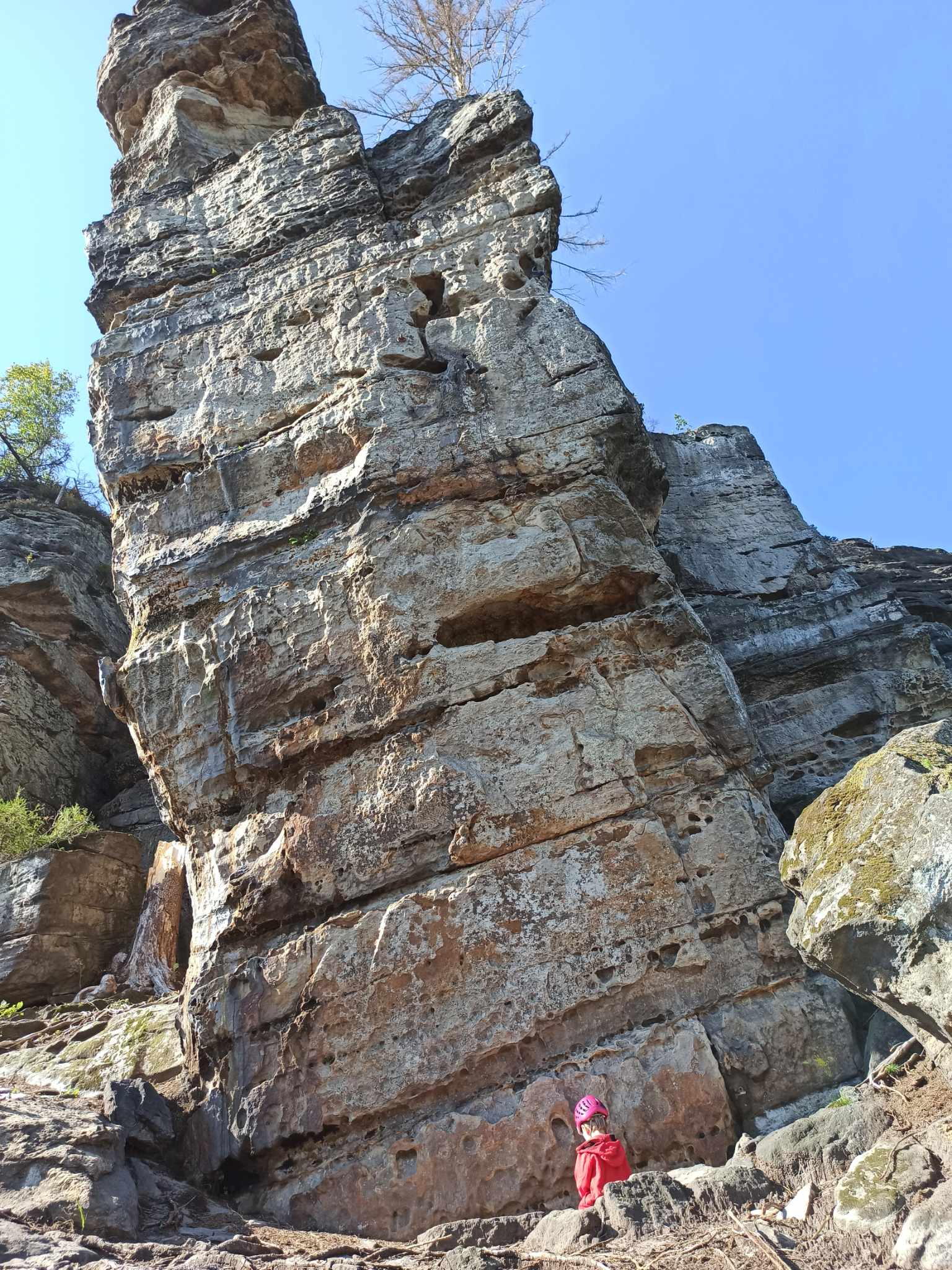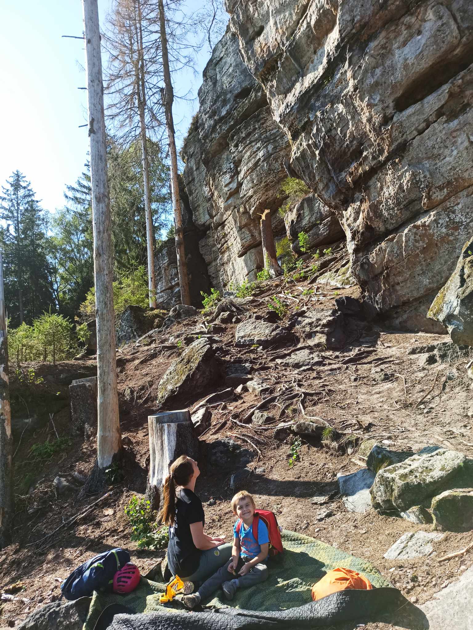 Droga wiedzie wygodną ścieżką, która w połowie staje się lekko stroma. Ostatni odcinek pod skały to teren pod górę, między kamieniami. Jeśli wspinacie się bez kogośc do pomocy, to moim zdaniem rejon nadaje się bardziej dla dzieci trochę starszych, w wieku 4-5 lat – takich, które samodzielnie i pewnie się przemieszczają, wówczas podejście będzie dla nich spacerem. Pod samymi skałami teren jest zróżnicowany, ale znajdą się miejsca na rozłożenie bazy tak, żeby mieć oko na dziecko. Zresztą z mojego doświadczenia wynika, że dziecko w tym wieku to już niekoniecznie lubi siedzieć „w bazie” a raczej spaceruje i eksploruje otoczenie wiedziony ciekawością, w tym miejscu raczej będzie bezpieczny. Tylko musi mieć na głowie kask! Po drodze jest kilka głazów z bulderami, więc dzieci mogą trochę pozginać łokcie.