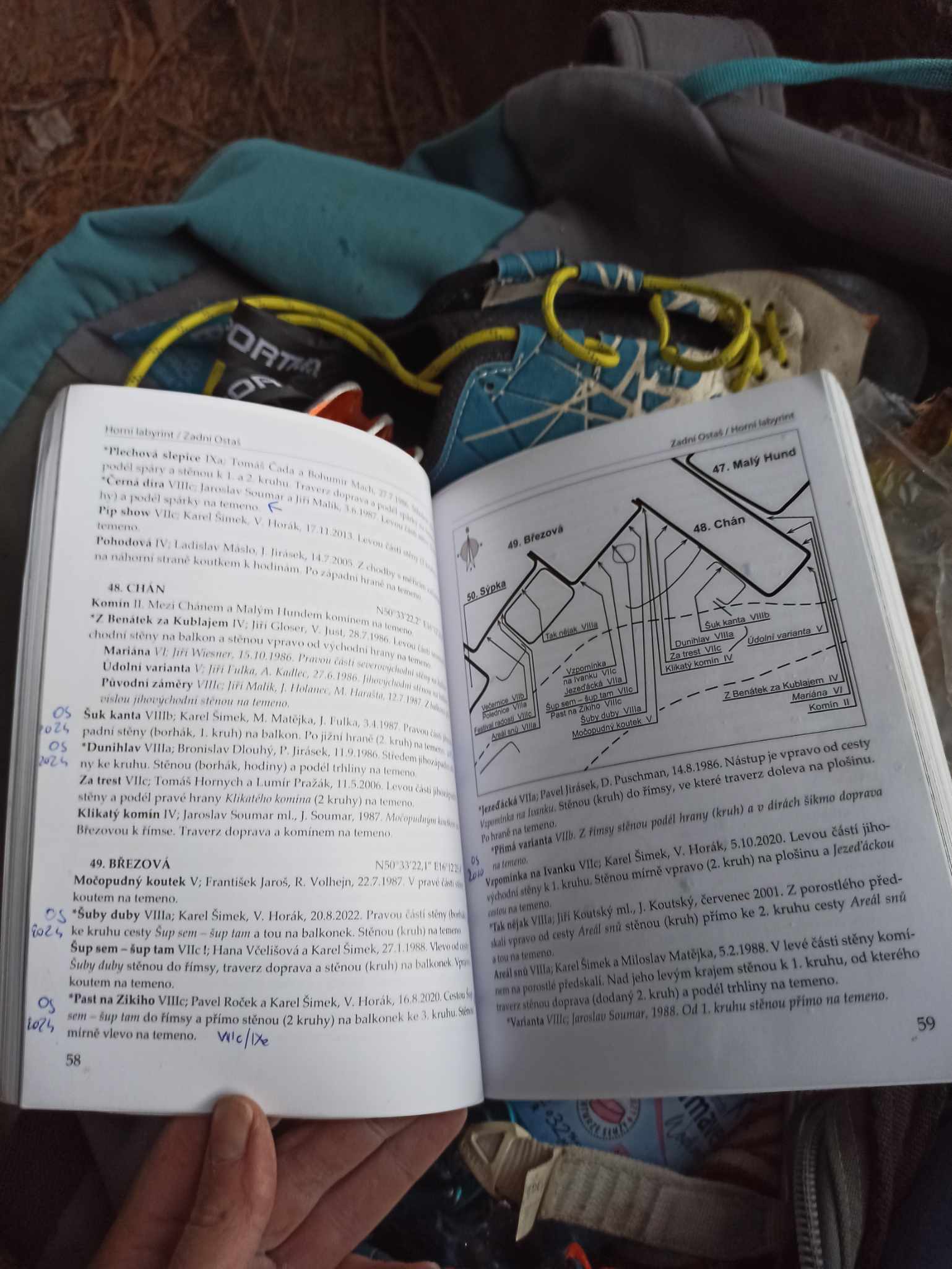 Rejon znajduje się w Czechach, około 15 kilometrów od polskiej granicy w Golińsku. Jest bardzo duży i składa się dwóch labiryntów, czyli Górny i Dolny Labirynt. Korzystaliśmy z przewodnika wspinaczkowego Petra Jenki i Adolfa Kadleca wydanego w 2023 roku – czyli jest to nowa książka. Topo zawiera dużo kolorowych zdjęć z ładnych dróg, a na końcu indeks skał. Przewodnik jest rysunkowy, ponadto operujemy na rzutach z góry, więc przyda się sztuka odczytywania dróg z takiej perspektywy i odrobina cierpliwości. Wspinają się w piachach powinniśmy pamiętać o etyce czyli „pravidlach sportovniho lezeni”. Pisząc krótko i na temat – nie wspinamy się po opadach deszczu (niektóry skały schną nawet kilka dni), nie opuszczamy się ze stanowisk tylko zjeżdżamy samodzielnie, na każdą drogę zabieramy ze sobą szczoteczkę do oczyszczenia skały. Stosowana jest skala saksońska. Polecam do wyboru dróg porównywanie ich z wycenami na stronie horosvaz.cz, ponieważ różnice są zauważalne.